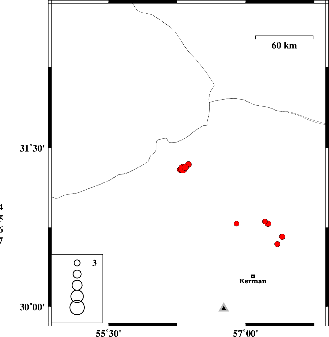 | 2018/04/19 | 05:45:23.9 | 10:15:23.9 | 30.786 | 57.244 | 14 | ML:2.9 | Kerman Province, 58 km North-East of Kerman | ||