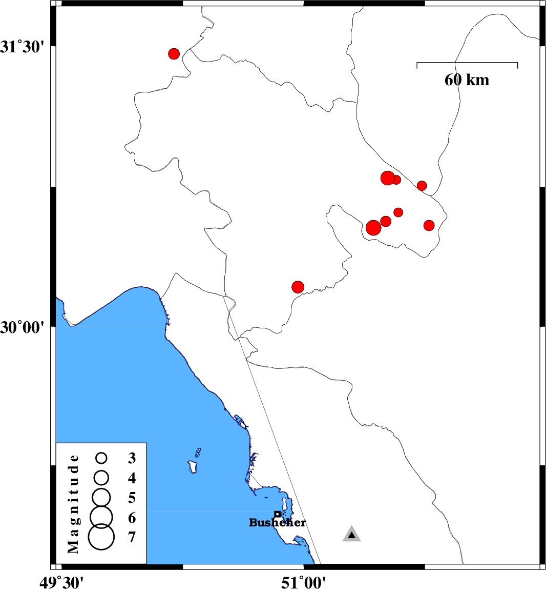 | 2018/05/17 | 08:46:55.3 | 13:16:55.3 | 30.212 | 50.963 | 15 | ML:3.4 | Kohkiluieh va boyerahmad Province, 23 km South-East of Dogonbadan | ||