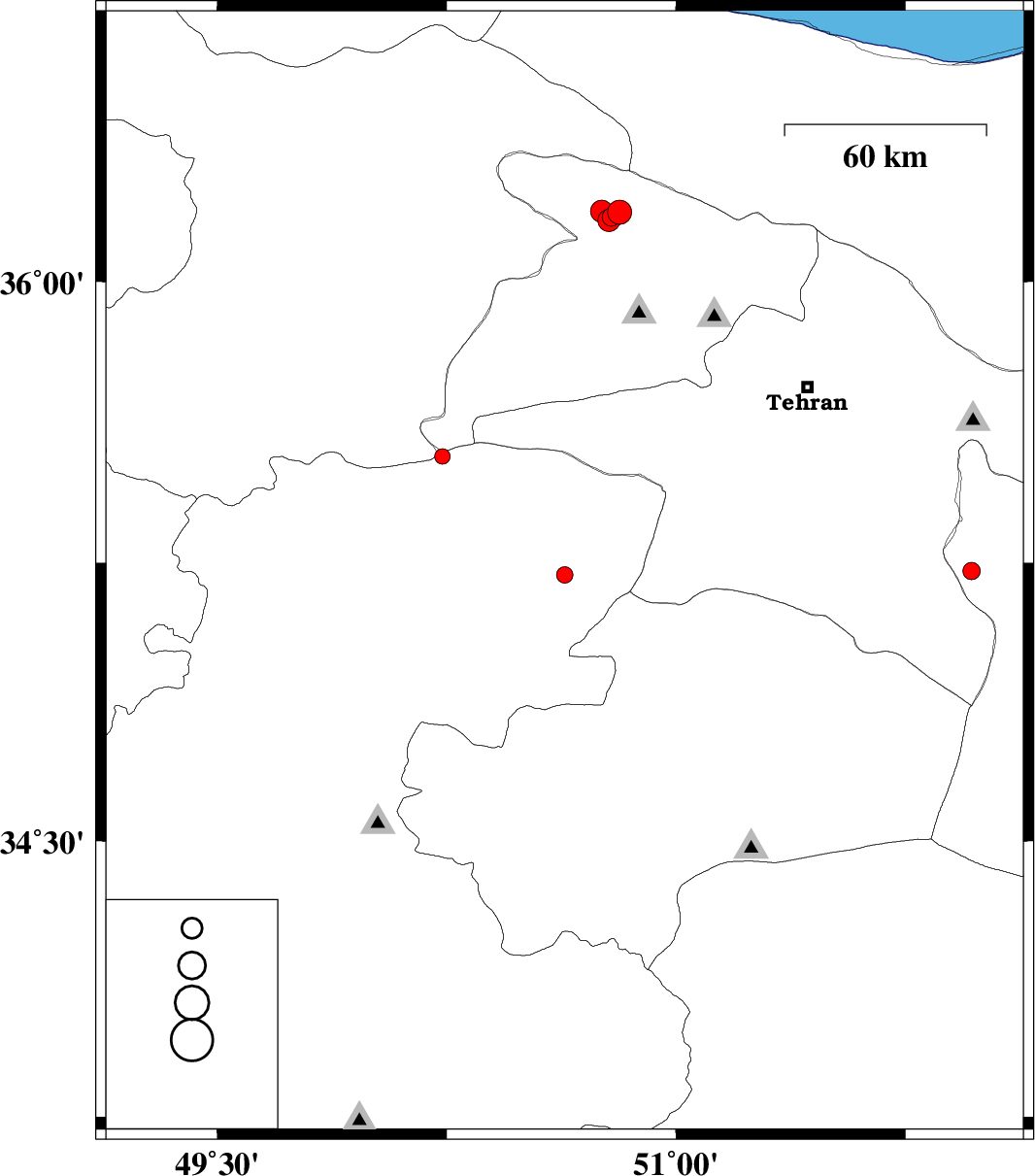 | 2018/05/12 | 23:28:26.9 | 03:58:26.9 | 36.162 | 50.78 | 15 | ML:3.2 | Tehran Province, 25 km North-East of Hashtgerd | ||