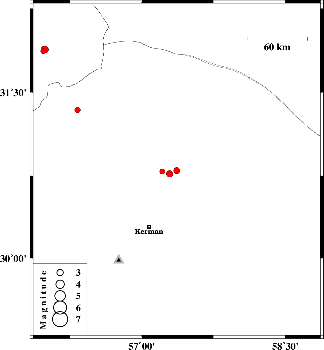| 2018/05/16 | 19:35:38.5 | 00:05:38.5 | 30.767 | 57.293 | 14 | ML:3.1 | Kerman Province, 57 km North-East of Kerman | ||