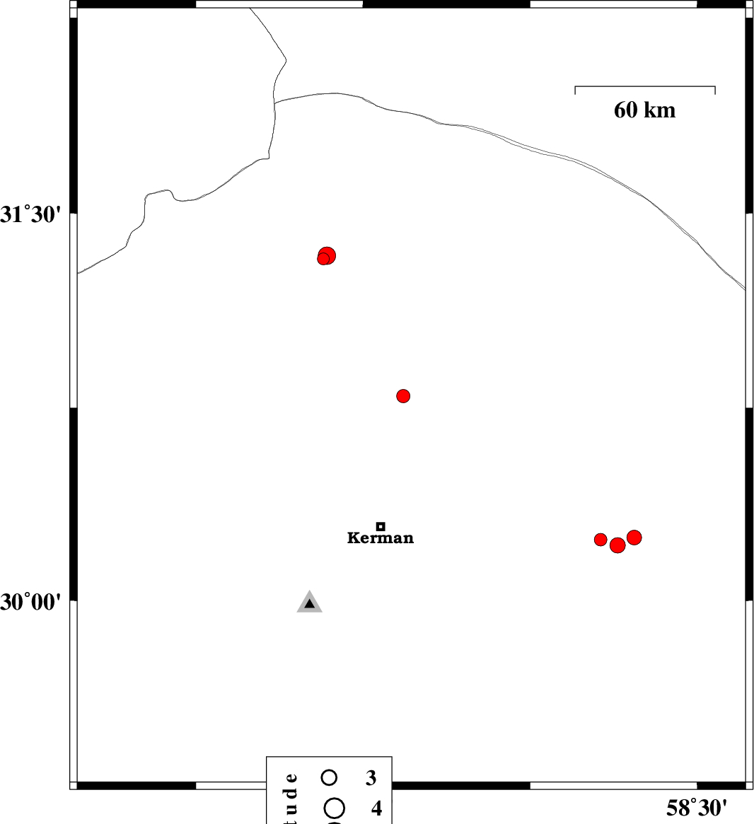 | 2018/05/17 | 10:18:29.6 | 14:48:29.6 | 30.796 | 57.367 | 15 | ML:2.9 | Kerman Province, 63 km North-East of Kerman | ||