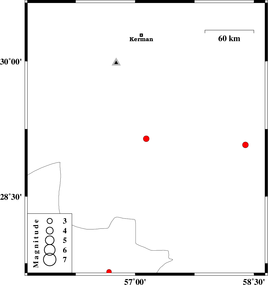 | 2018/03/26 | 03:21:01.8 | 07:51:01.8 | 29.074 | 58.393 | 14 | ML:3.4 | Kerman Province, 5 km of Bam |