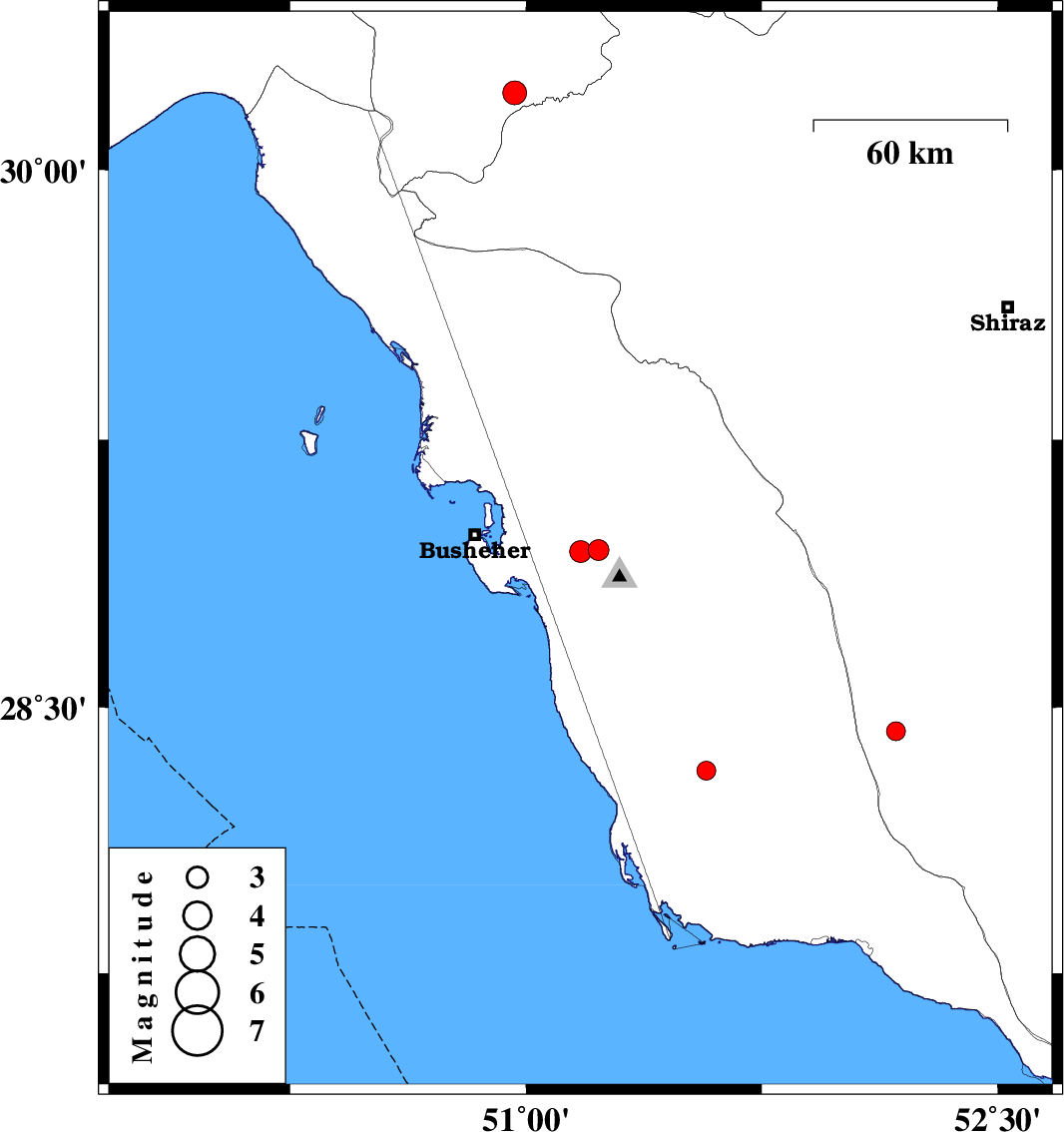 | 2018/05/16 | 15:10:09.3 | 19:40:09.3 | 28.433 | 52.177 | 6 | ML:2.7 | Fars Province, 50 km South of Farashband |