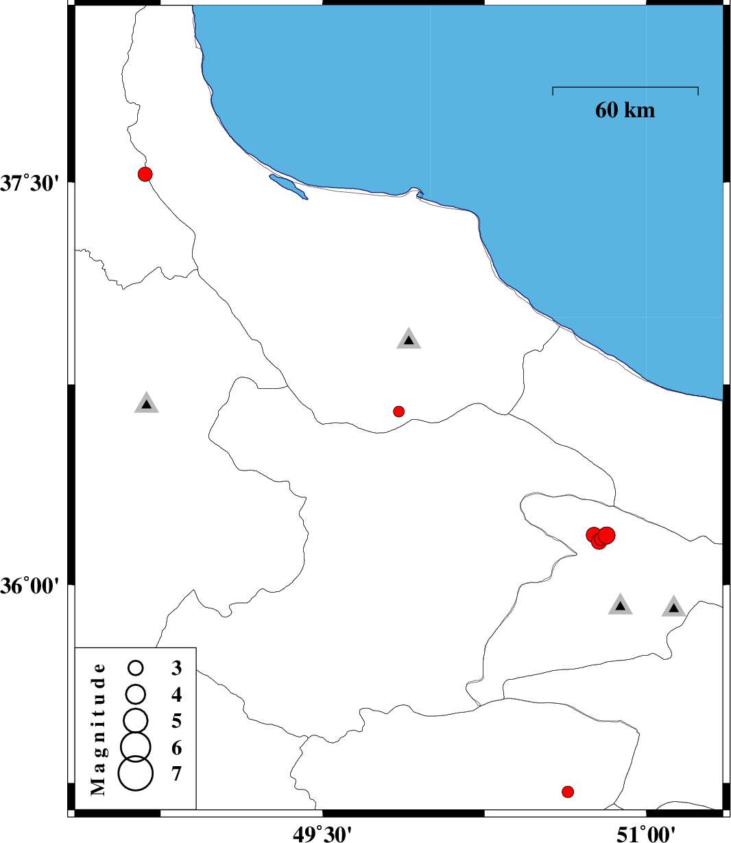 | 2018/05/23 | 05:46:11.3 | 10:16:11.3 | 36.649 | 49.853 | 17 | ML:2.2 | Gilan Province, 56 km South of Siahkal | ||