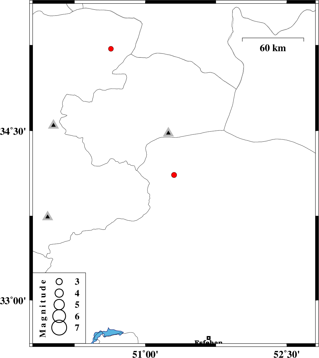 | 2018/05/22 | 16:56:16.8 | 21:26:16.8 | 34.112 | 51.305 | 43 | ML:2.6 | Esfahan Province, 16 km -West of Aran va bidgol | ||