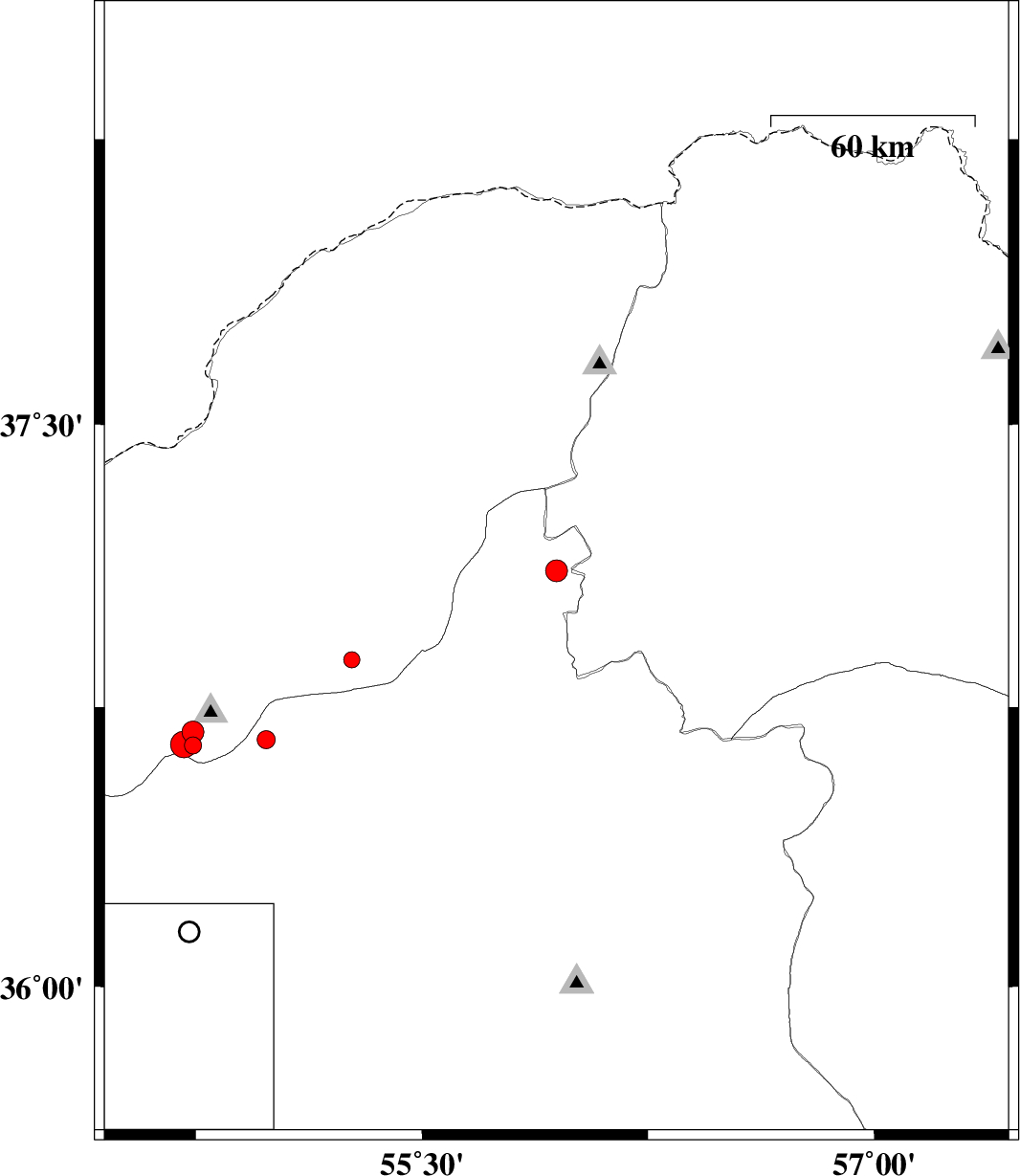 | 2018/05/24 | 22:09:46.3 | 02:39:46.3 | 37.113 | 55.946 | 7 | ML:3.2 | Semnan Province, 43 km North-West of Jajarm | ||