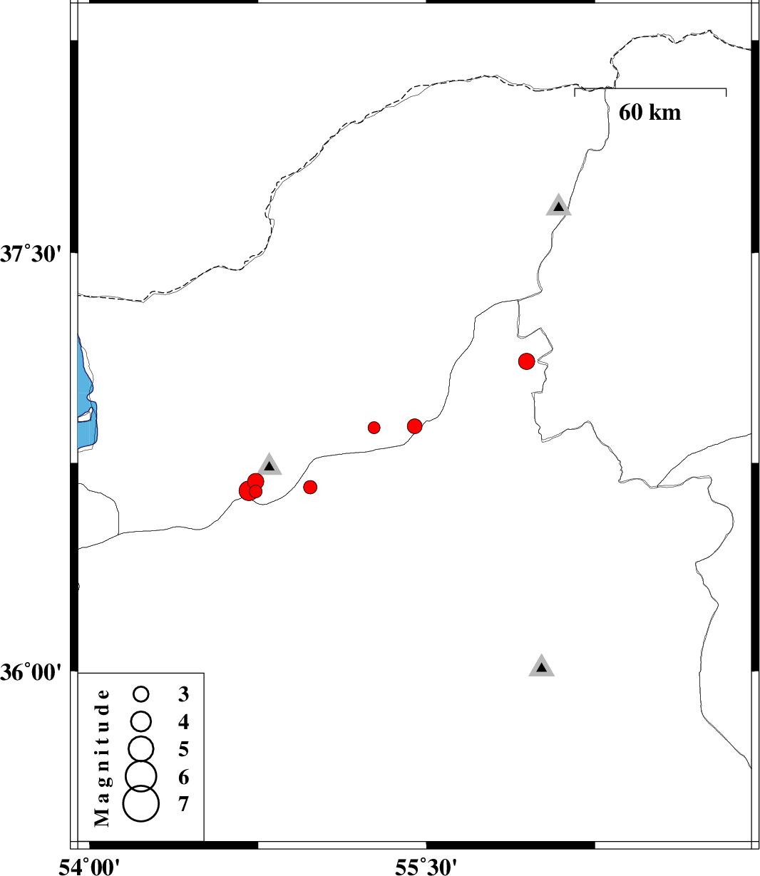 | 2018/05/24 | 22:09:46.3 | 02:39:46.3 | 37.113 | 55.946 | 7 | ML:3.2 | Semnan Province, 43 km North-West of Jajarm | ||