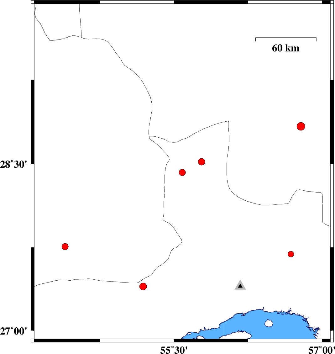 | 2018/05/26 | 12:37:57.9 | 17:07:57.9 | 27.69 | 56.684 | 18 | ML:2.7 | Hormozgan Province, 62 km North-West of Dehbarez | ||