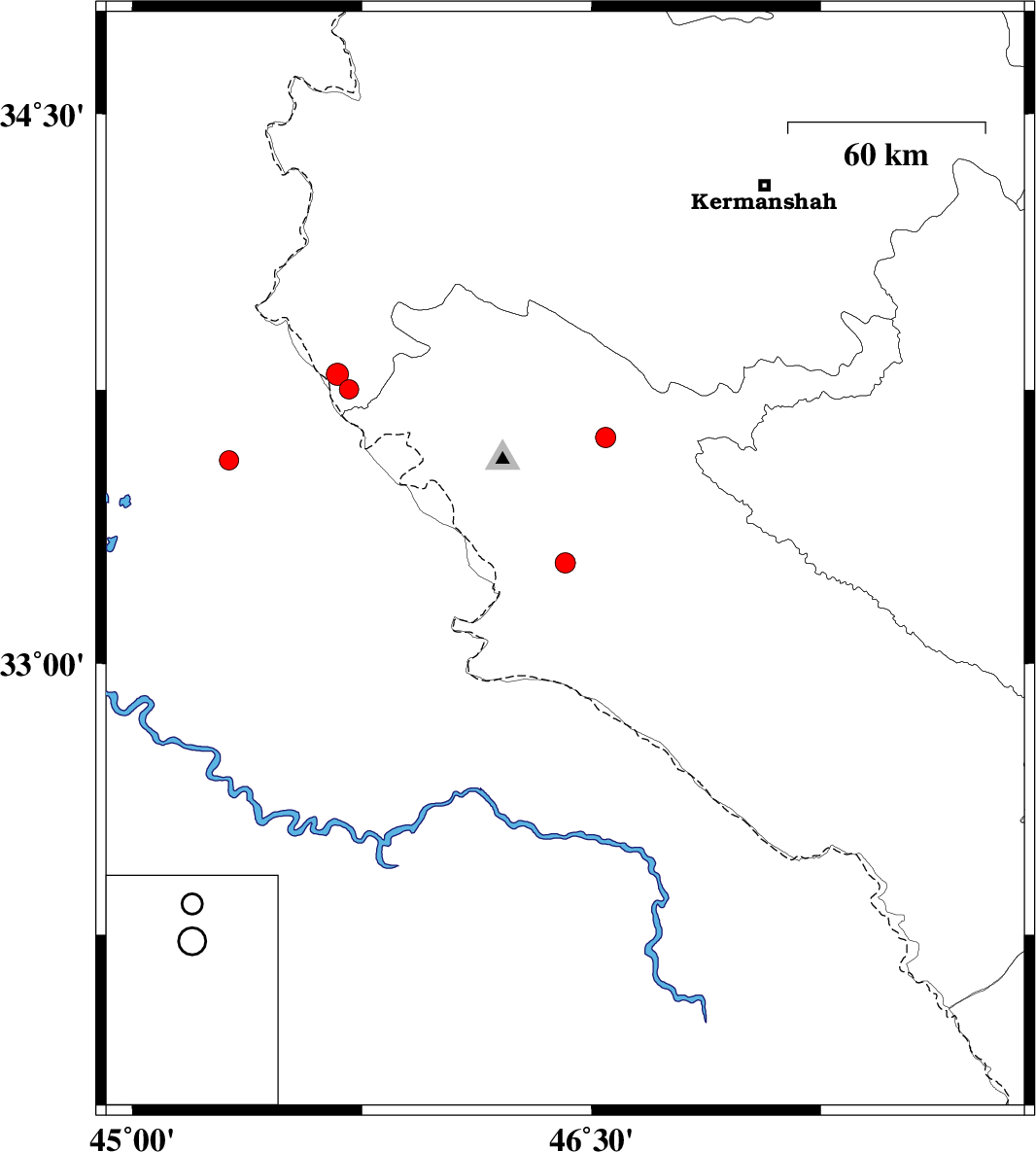 | 2018/05/26 | 04:50:52.7 | 09:20:52.7 | 33.751 | 45.708 | 14 | ML:2.8 | Kermanshah Province, 48 km South-West of Gilan-E-Gharb | ||