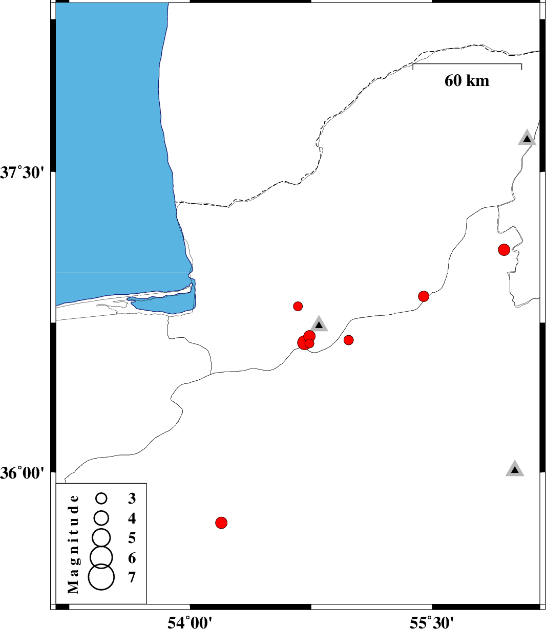 | 2018/05/24 | 22:09:46.3 | 02:39:46.3 | 37.113 | 55.946 | 7 | ML:3.2 | Semnan Province, 43 km North-West of Jajarm | ||
