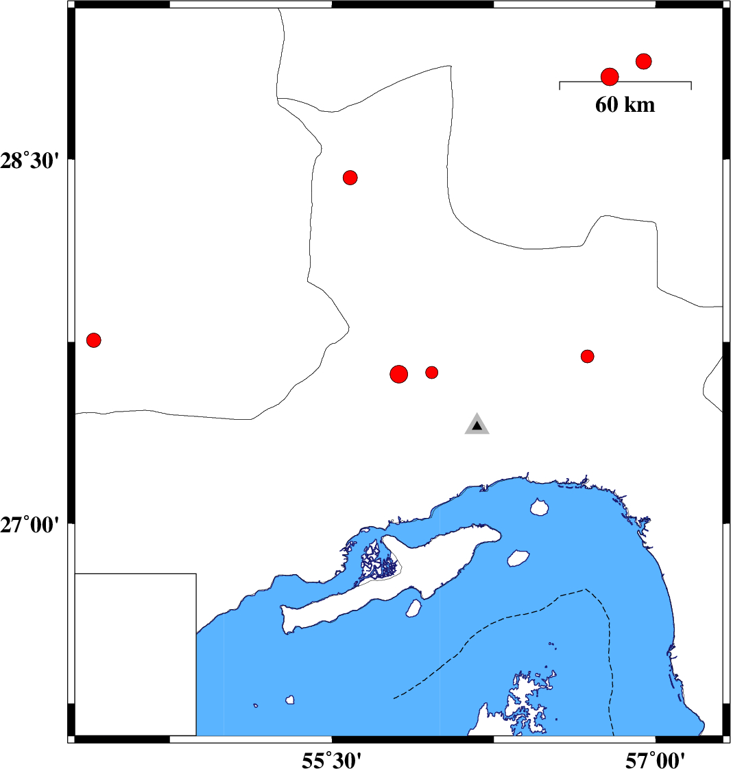 | 2018/06/02 | 02:40:56.0 | 07:10:56.0 | 27.616 | 55.81 | 15 | ML:3.6 | Hormozgan Province, 78 km South of Hajiabad | ||