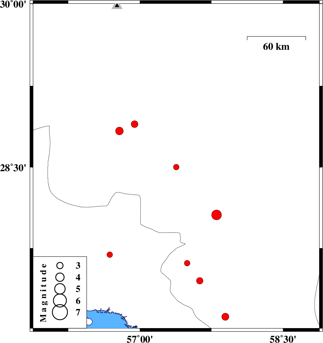 | 2018/05/08 | 18:27:35.2 | 22:57:35.2 | 28.059 | 57.804 | 15 | ML:4.6 | Kerman Province, 16 km North-East of Kahnuj |