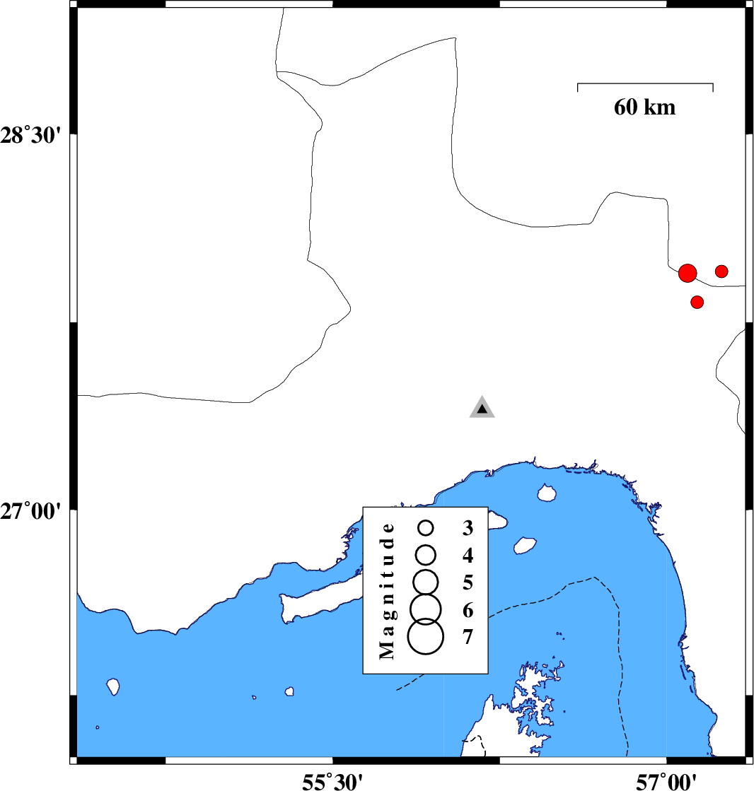 | 2018/06/02 | 02:35:13.1 | 07:05:13.1 | 28.898 | 56.944 | 14 | ML:3.2 | Kerman Province, 50 km South-East of Baft | ||