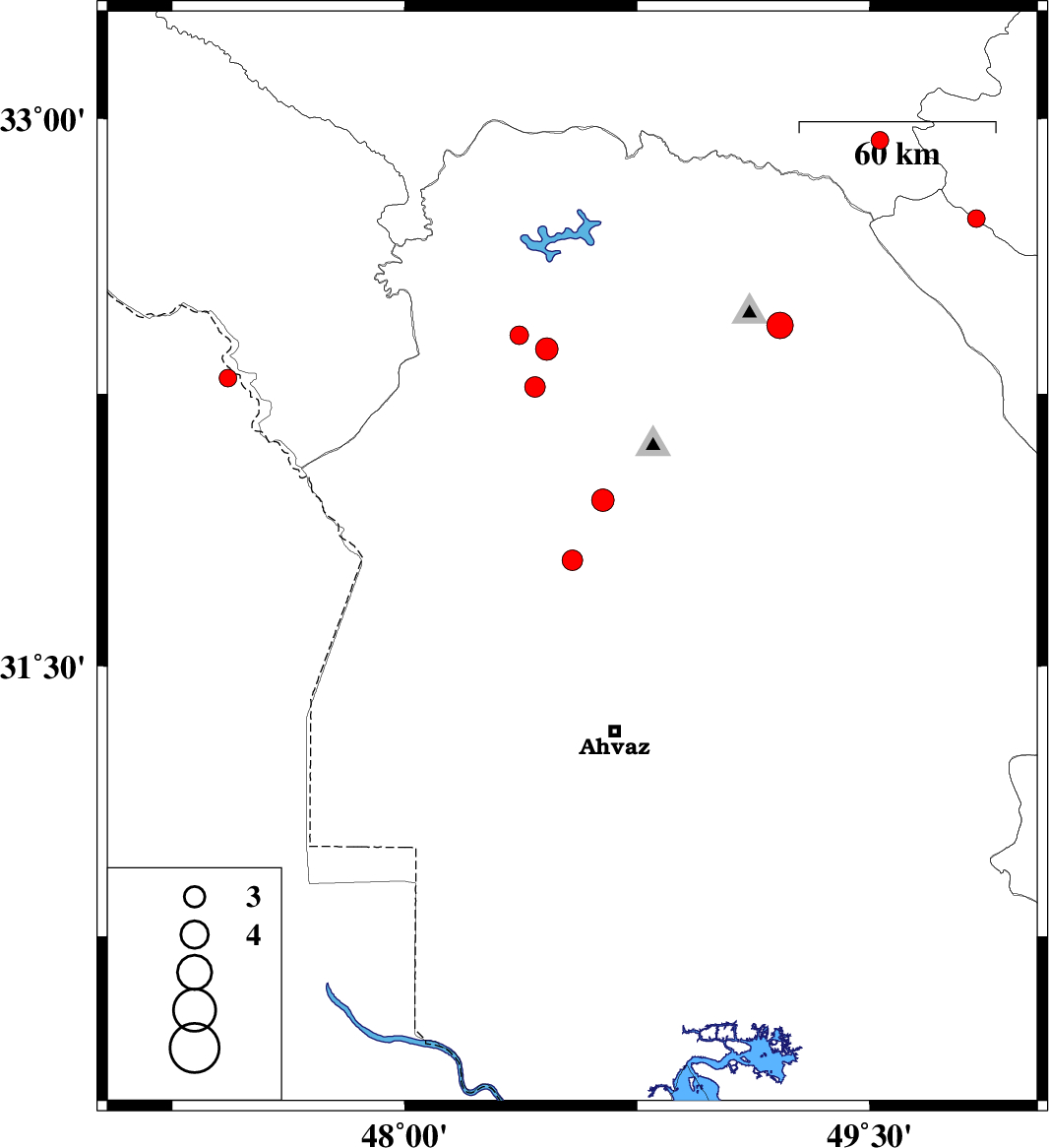 | 2018/06/02 | 06:39:41.1 | 11:09:41.1 | 32.268 | 48.421 | 15 | ML:3 | Khoozestan Province, 13 km South of Dezful | ||