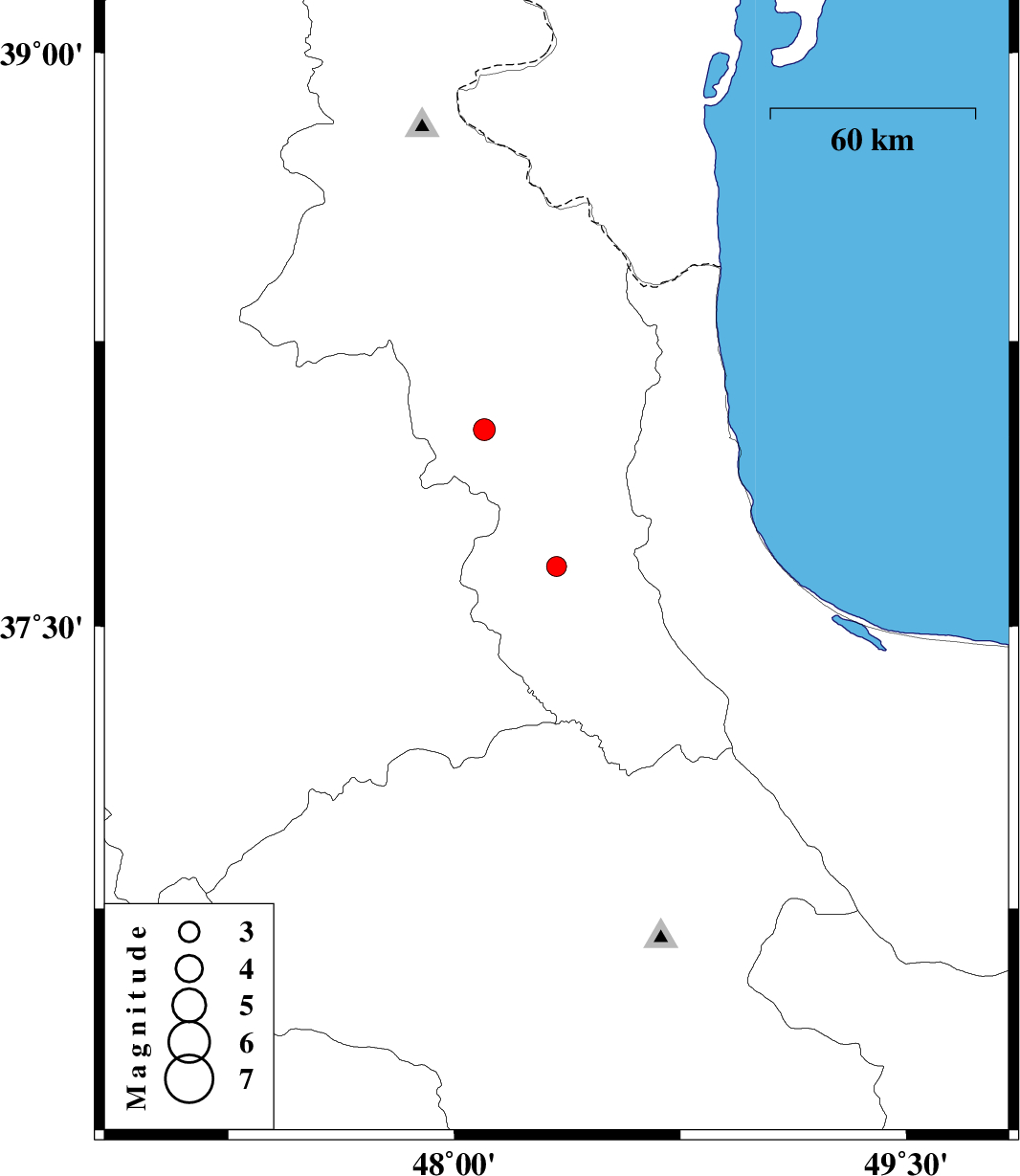 | 2018/05/31 | 23:52:30.8 | 04:22:30.8 | 38.018 | 48.099 | 15 | ML:3.2 | Ardebil Province, 6 km of Nir |