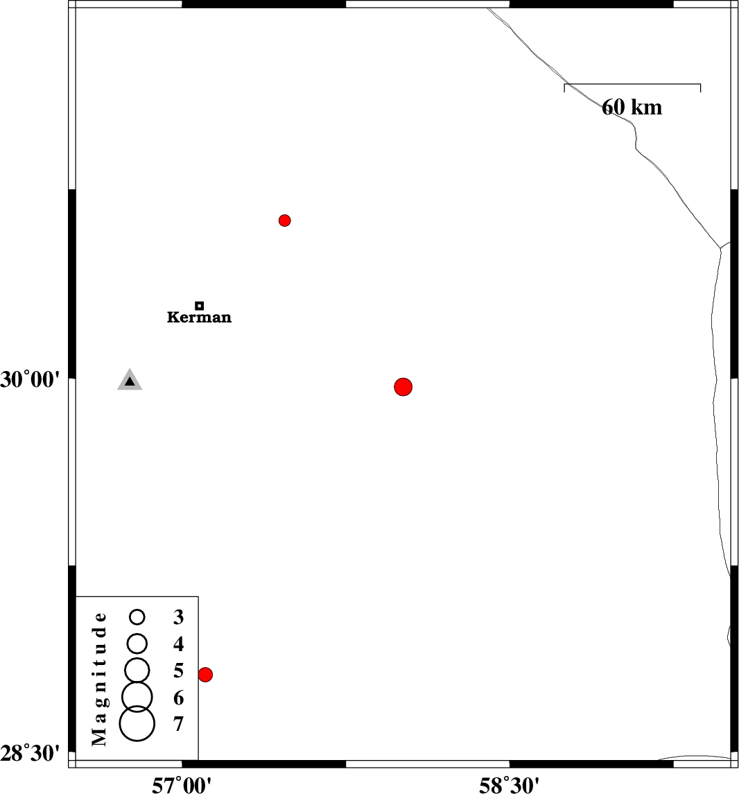 | 2018/06/11 | 09:58:01.1 | 14:28:01.1 | 30.626 | 57.469 | 14 | ML:2.4 | Kerman Province, 53 km North-East of Kerman | ||