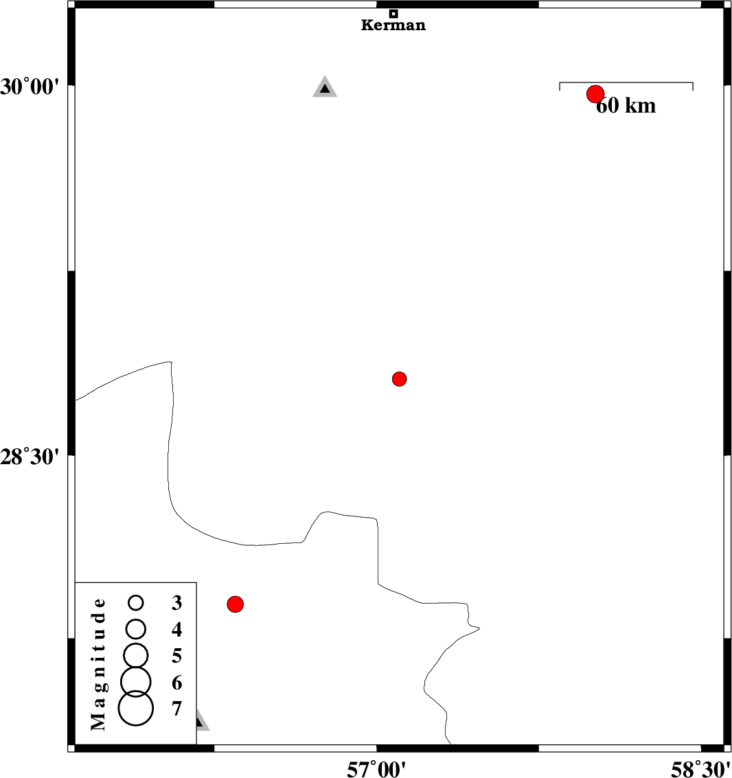 | 2018/06/11 | 03:40:24.0 | 08:10:24.0 | 29.965 | 58.012 | 15 | ML:3.6 | Kerman Province, 101 km North-West of Bam |