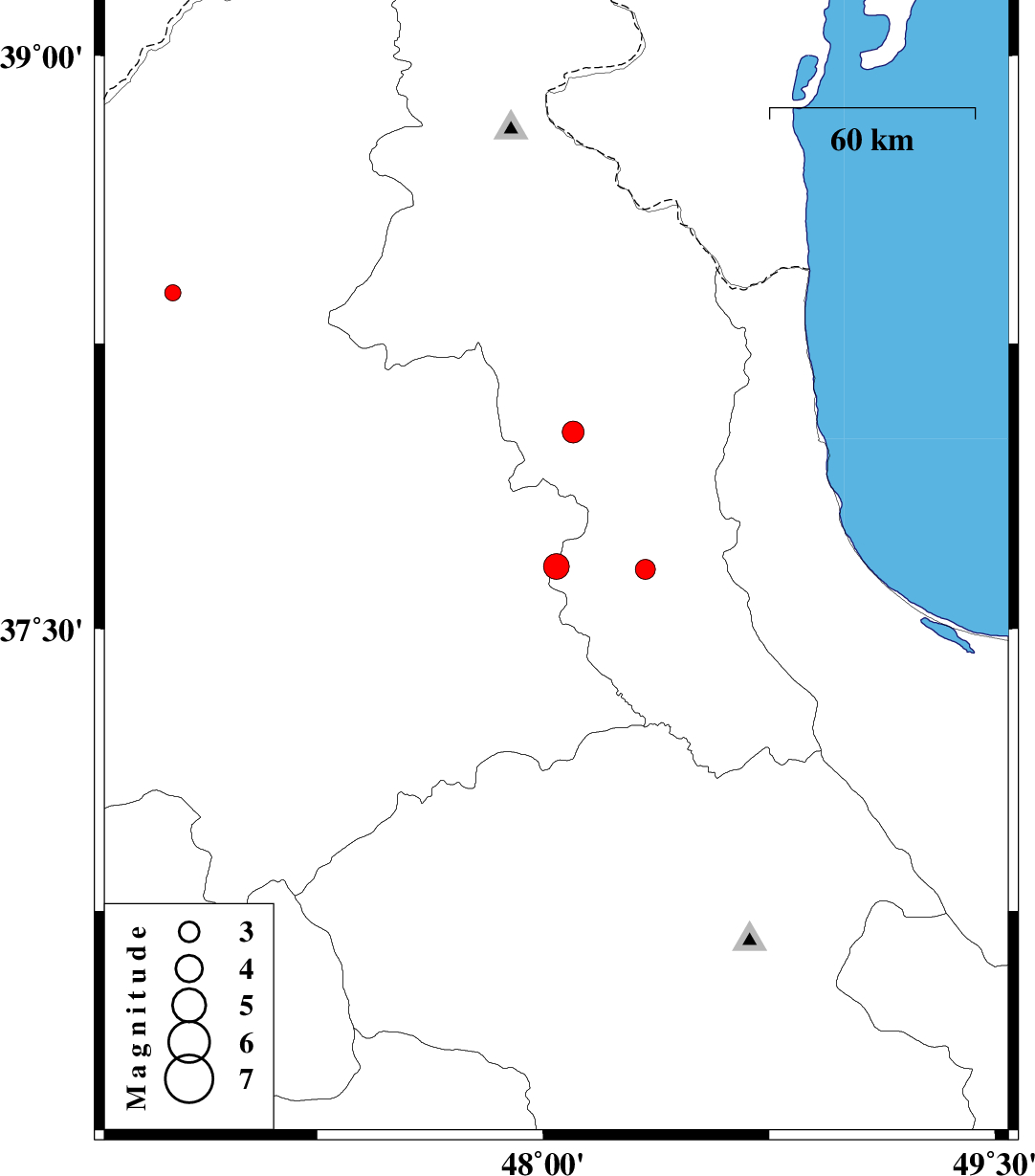 | 2018/05/31 | 23:52:30.8 | 04:22:30.8 | 38.018 | 48.099 | 15 | ML:3.2 | Ardebil Province, 6 km of Nir |