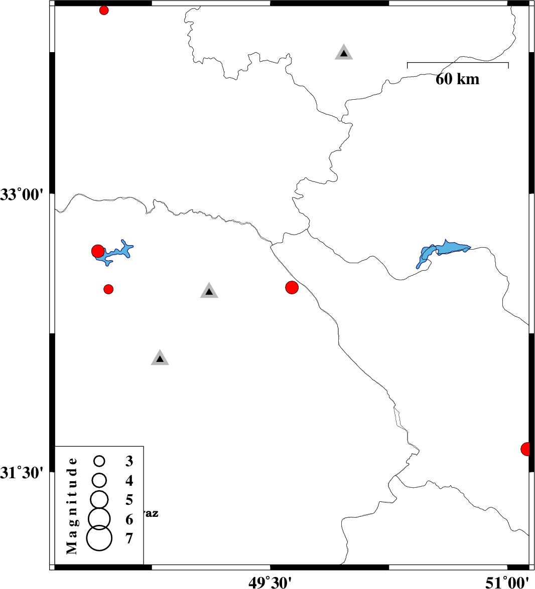 | 2018/06/11 | 23:43:46.6 | 04:13:46.6 | 32.691 | 48.409 | 14 | ML:3.6 | Khoozestan Province, 26 km North of Andimeshk |