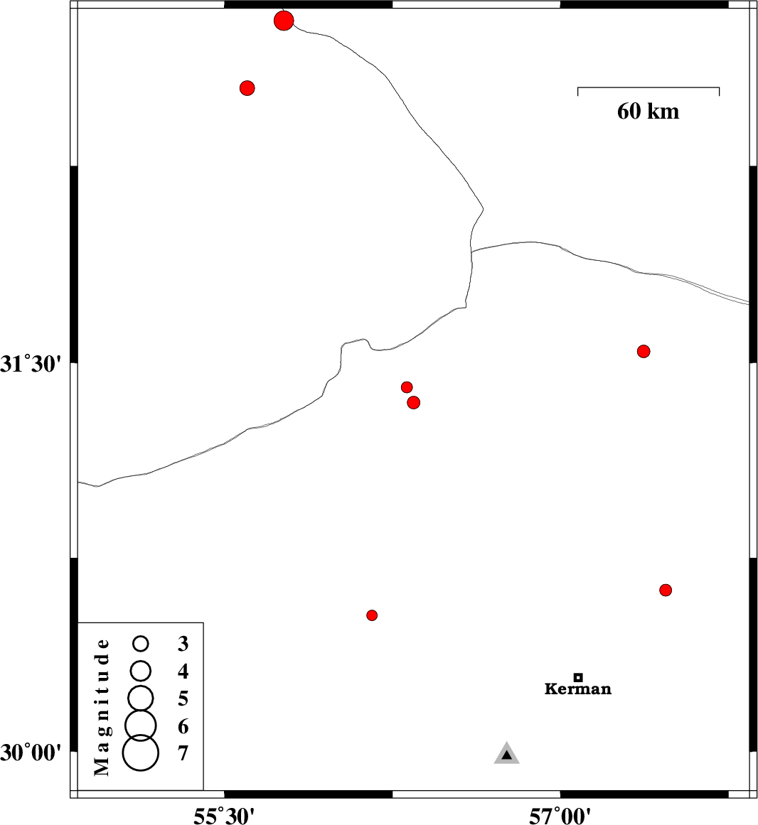 | 2018/06/11 | 09:58:01.1 | 14:28:01.1 | 30.626 | 57.469 | 14 | ML:2.4 | Kerman Province, 53 km North-East of Kerman | ||