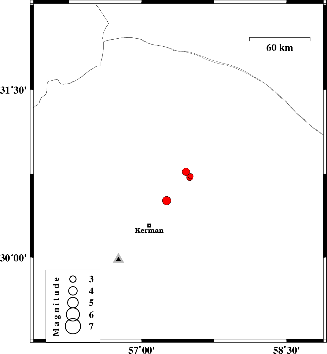 | 2018/06/23 | 00:23:00.2 | 04:53:00.2 | 30.748 | 57.371 | 14 | ML:2.9 | Kerman Province, 58 km North-East of Kerman | ||