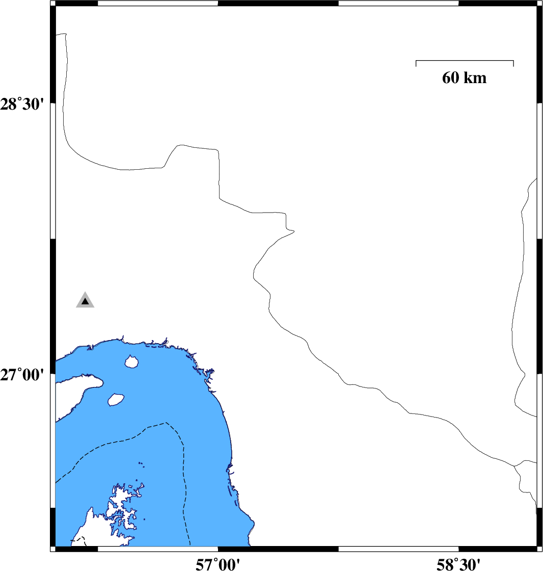| 2018/06/27 | 23:46:33.9 | 04:16:33.9 | 27.533 | 57.487 | 15 | ML:4 | Kerman Province, 14 km North of Manujan |
