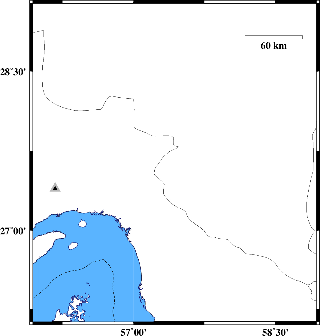 | 2018/06/27 | 23:46:33.9 | 04:16:33.9 | 27.533 | 57.487 | 15 | ML:4 | Kerman Province, 14 km North of Manujan |