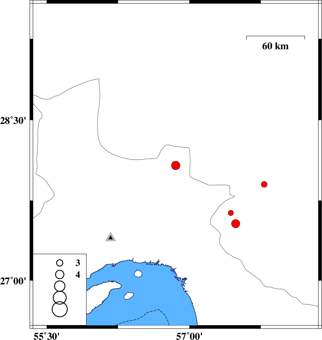 | 2018/07/04 | 00:57:45.5 | 05:27:45.5 | 28.077 | 56.856 | 17 | ML:4.1 | Hormozgan Province, 83 km North-West of Kahnuj | ||