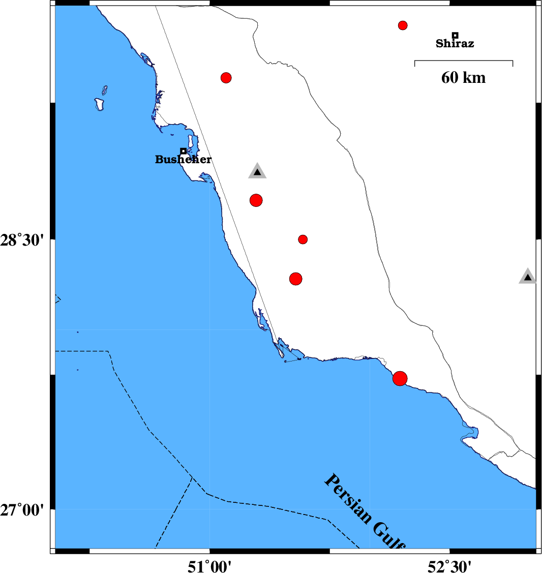 | 2018/06/28 | 22:16:16.1 | 02:46:16.1 | 29.387 | 51.103 | 14 | ML:2.9 | Bushehr Province, 17 km North-West of Borazjan | ||
