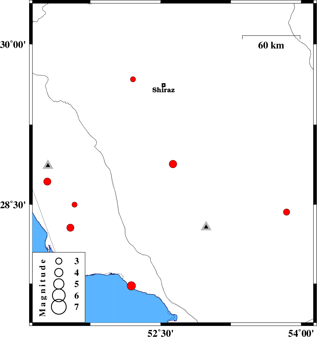 | 2018/06/19 | 05:21:43.6 | 09:51:43.6 | 29.673 | 52.205 | 14 | ML:2.5 | Fars Province, 32 km -West of Shiraz | ||