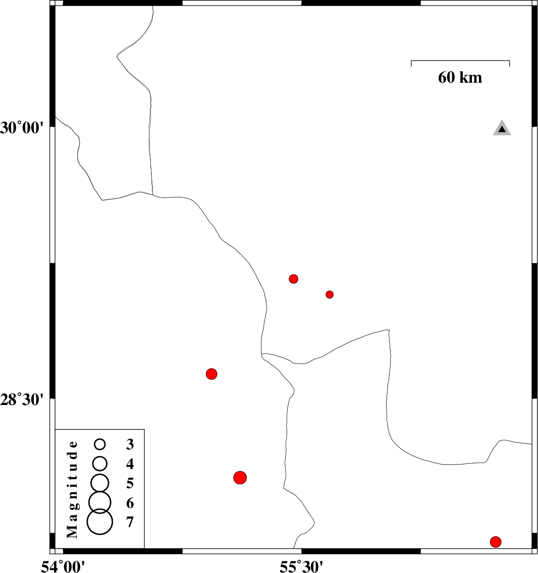 | 2018/07/13 | 09:37:50.5 | 14:07:50.5 | 29.162 | 55.449 | 15 | ML:2.6 | Kerman Province, 38 km South-West of Sirjan | ||