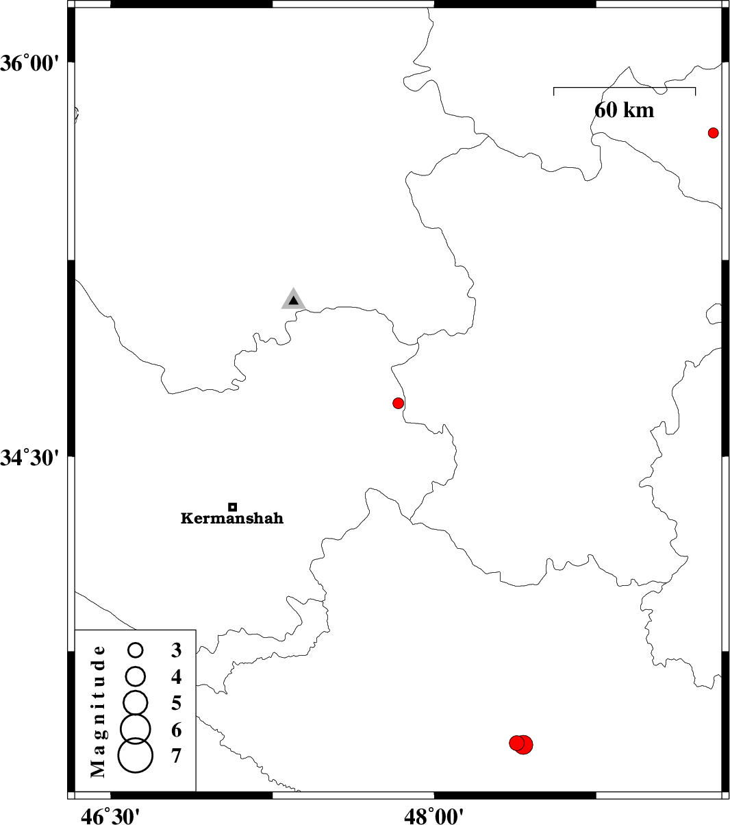 | 2018/07/16 | 01:45:36.2 | 06:15:36.2 | 34.704 | 47.833 | 14 | ML:2.3 | Kermanshah Province, 25 km North-West of Kangavar | ||
