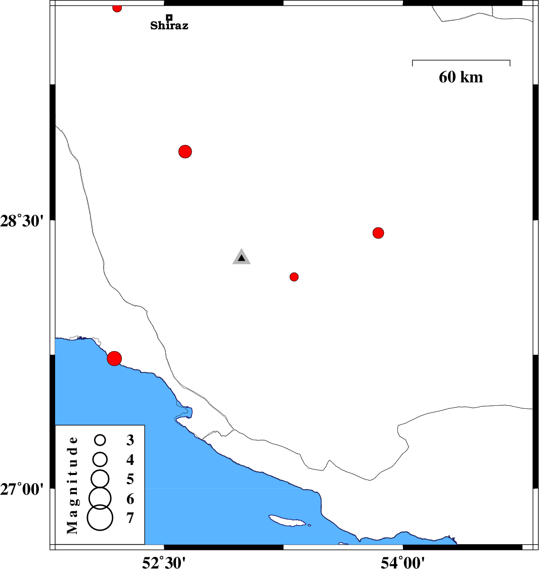 | 2018/07/12 | 07:32:52.2 | 12:02:52.2 | 28.88 | 52.632 | 14 | ML:3.7 | Fars Province, 7 km of Firuz Abad | ||