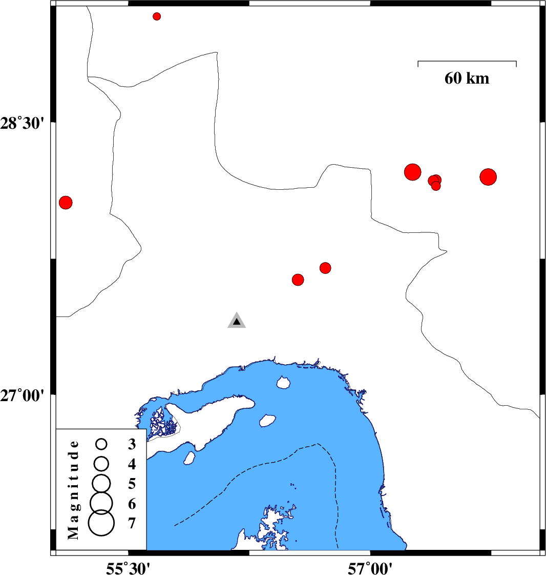 | 2018/07/15 | 11:48:25.7 | 16:18:25.7 | 28.2 | 57.731 | 16 | ML:4.7 | Kerman Province, 28 km North of Kahnuj | ||