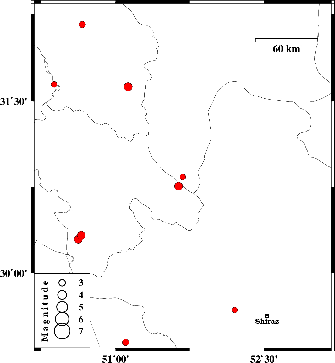 | 2018/06/19 | 05:21:43.6 | 09:51:43.6 | 29.673 | 52.205 | 14 | ML:2.5 | Fars Province, 32 km -West of Shiraz | ||