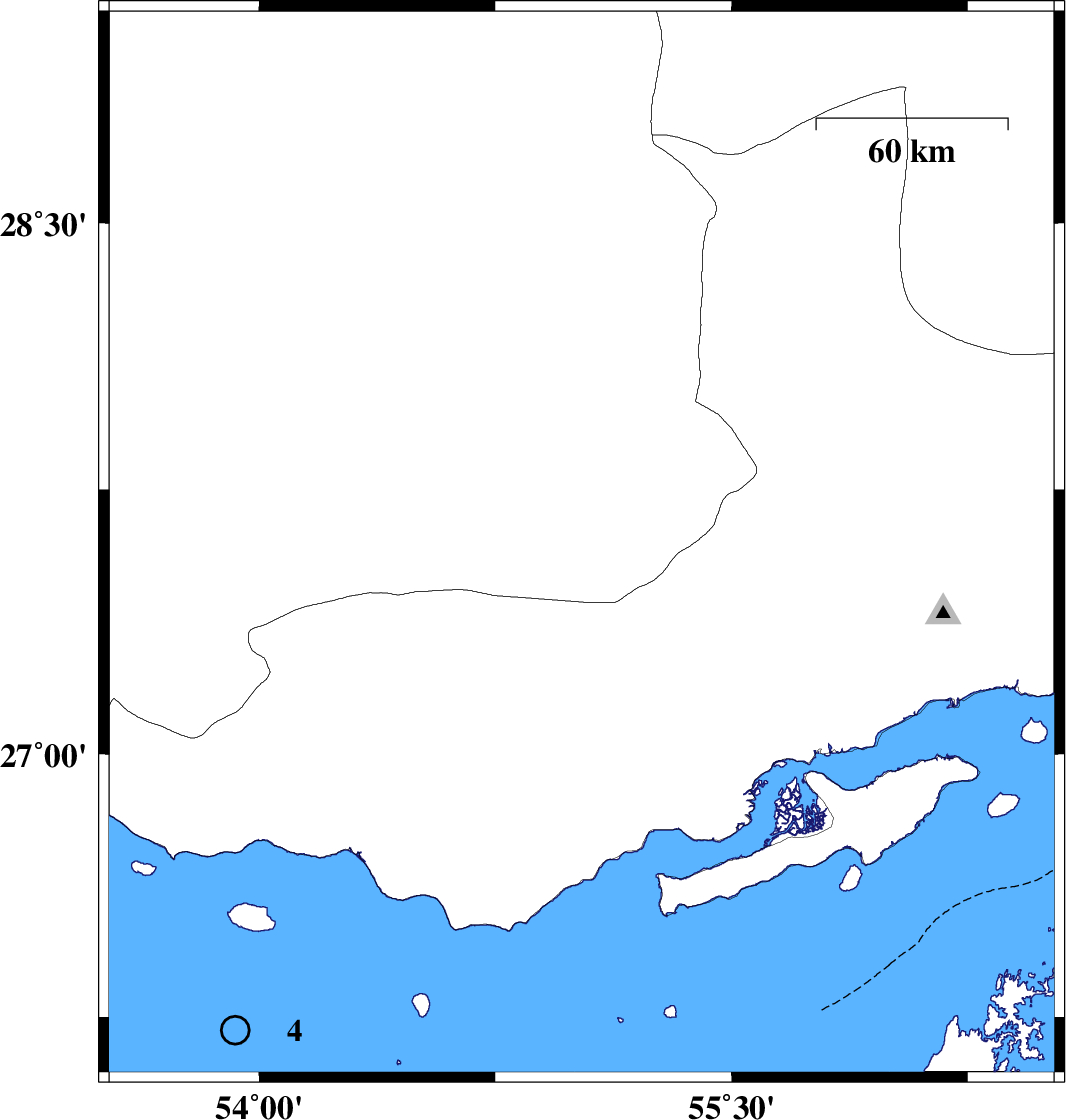 | 2018/07/22 | 20:59:51.2 | 01:29:51.2 | 27.478 | 54.943 | 14 | ML:4.8 | Fars Province, 64 km South-East of Lar | ||