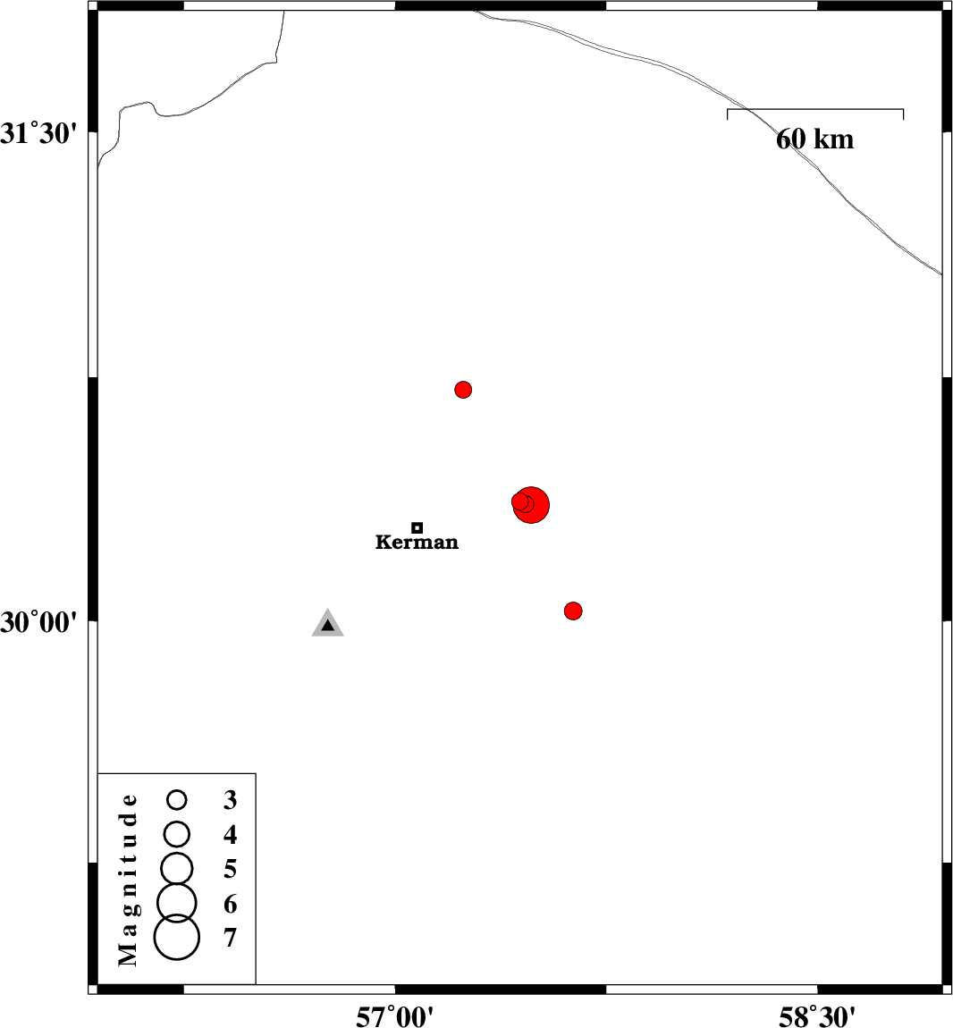 | 2018/07/26 | 23:35:22.4 | 04:05:22.4 | 30.712 | 57.242 | 14 | ML:2.7 | Kerman Province, 50 km North-East of Kerman | ||