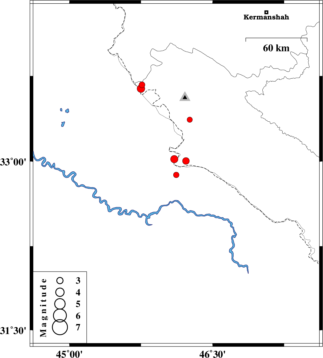 | 2018/08/12 | 04:16:21.9 | 08:46:21.9 | 32.882 | 46.119 | 6 | ML:2.7 | Iraq, 27 km South of Mehran | ||