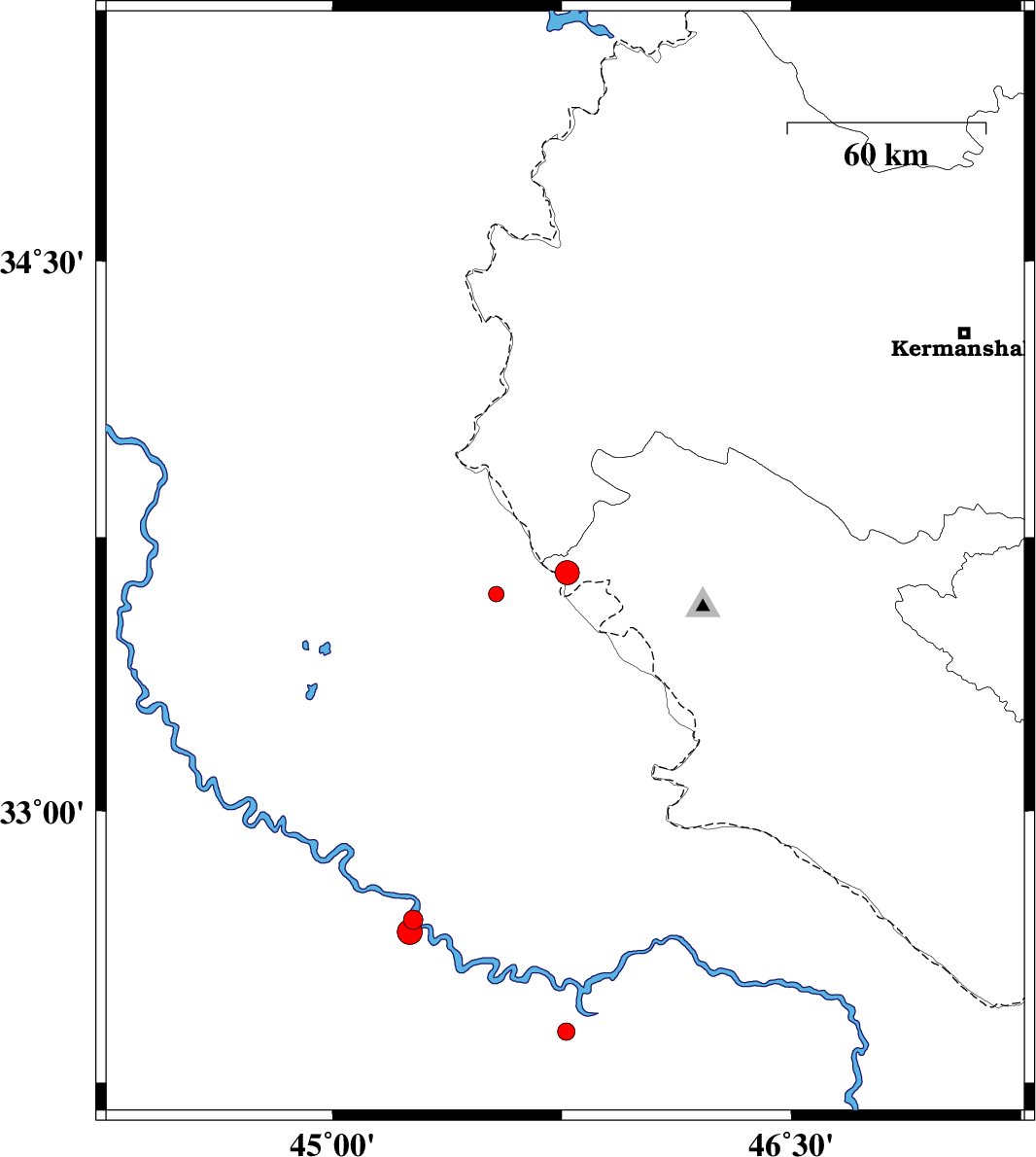| 2018/08/12 | 07:57:05.0 | 12:27:05.0 | 33.674 | 45.761 | 14 | ML:2.8 | Ilam Province, 54 km South-West of Gilan-E-Gharb | ||