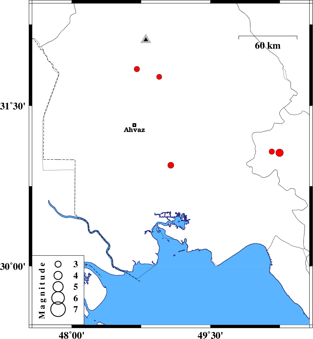 | 2018/07/16 | 02:27:36.0 | 06:57:36.0 | 31.768 | 48.946 | 15 | ML:2.5 | Khoozestan Province, 32 km South of Shushtar |