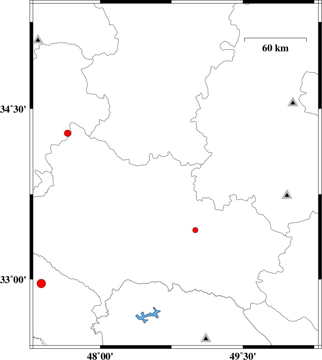 | 2018/08/12 | 03:28:01.9 | 07:58:01.9 | 32.612 | 48.658 | 17 | ML:2.9 | Khoozestan Province, 33 km North-East of Andimeshk | ||