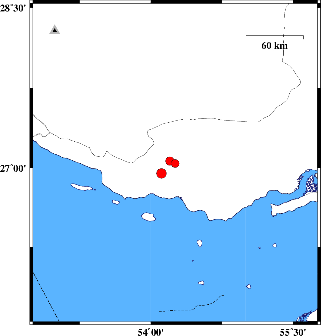 | 2018/08/24 | 18:18:42.8 | 22:48:42.8 | 27.041 | 54.257 | 15 | ML:3.8 | Hormozgan Province, 20 km South-West of Bastak | ||