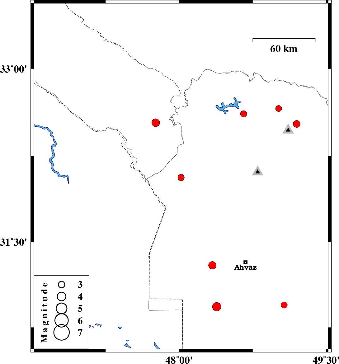 | 2018/08/27 | 23:45:57.5 | 04:15:57.5 | 32.06 | 48.02 | 15 | ML:2.9 | Khoozestan Province, 27 km South-West of Shush | ||