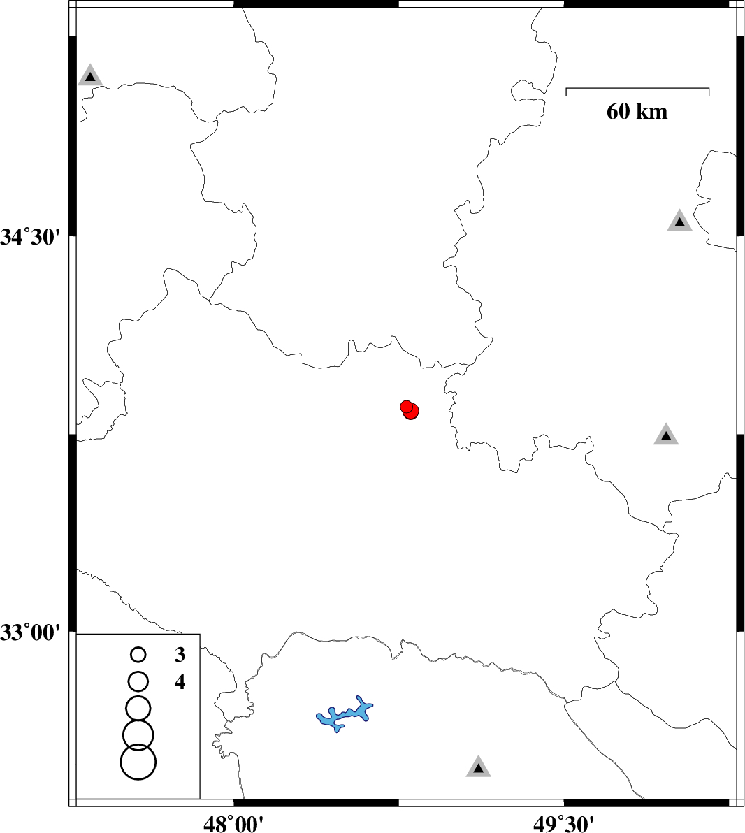 | 2018/08/27 | 22:57:29.2 | 03:27:29.2 | 33.836 | 48.803 | 15 | ML:3.1 | Lorestan Province, 8 km of Borujerd |