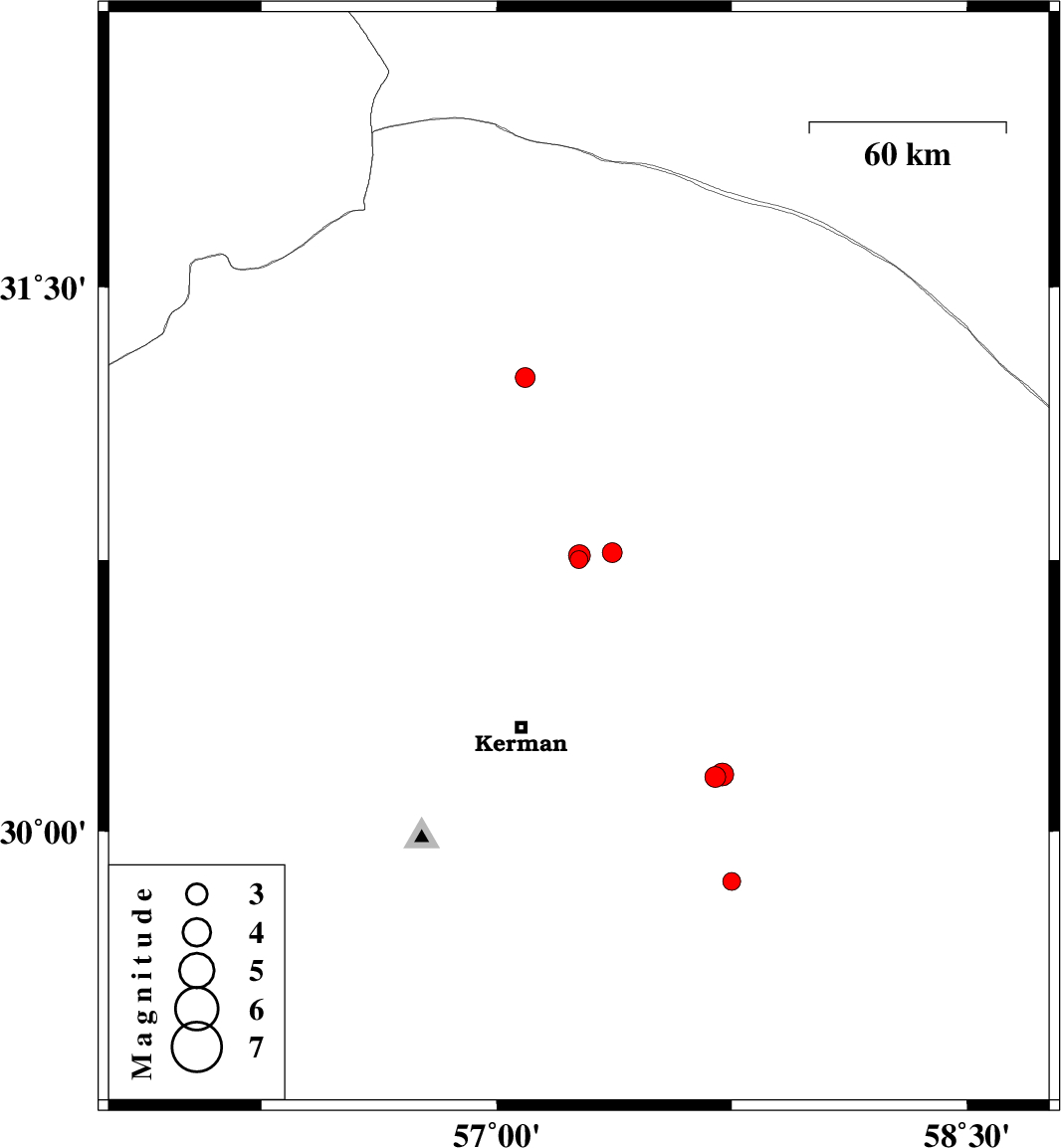 | 2018/09/02 | 19:00:44.6 | 23:30:44.6 | 30.151 | 57.697 | 14 | ML:2.9 | Kerman Province, 61 km South-East of Kerman | ||