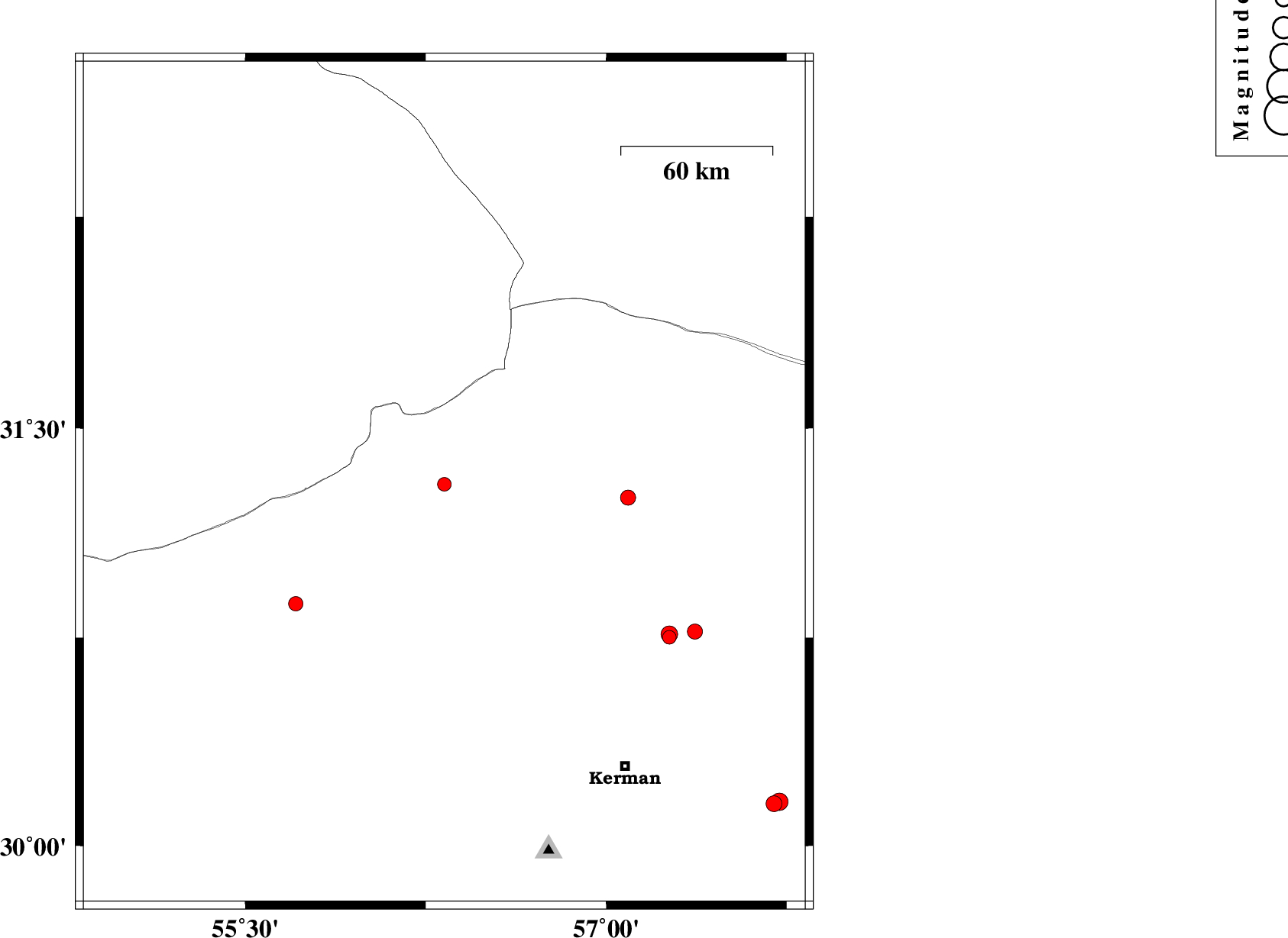 | 2018/09/04 | 17:35:42.3 | 22:05:42.3 | 30.771 | 57.368 | 14 | ML:2.8 | Kerman Province, 60 km North-East of Kerman | ||