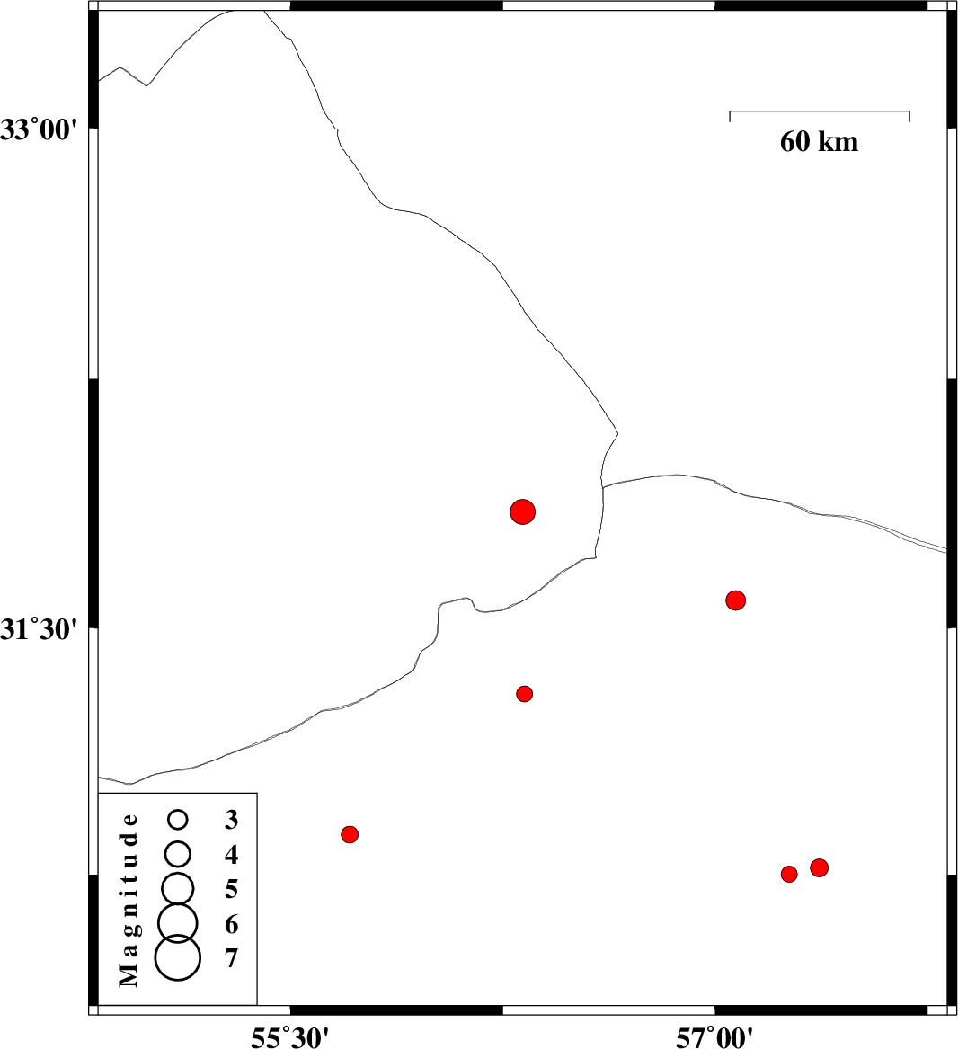 | 2018/09/04 | 17:35:42.3 | 22:05:42.3 | 30.771 | 57.368 | 14 | ML:2.8 | Kerman Province, 60 km North-East of Kerman | ||