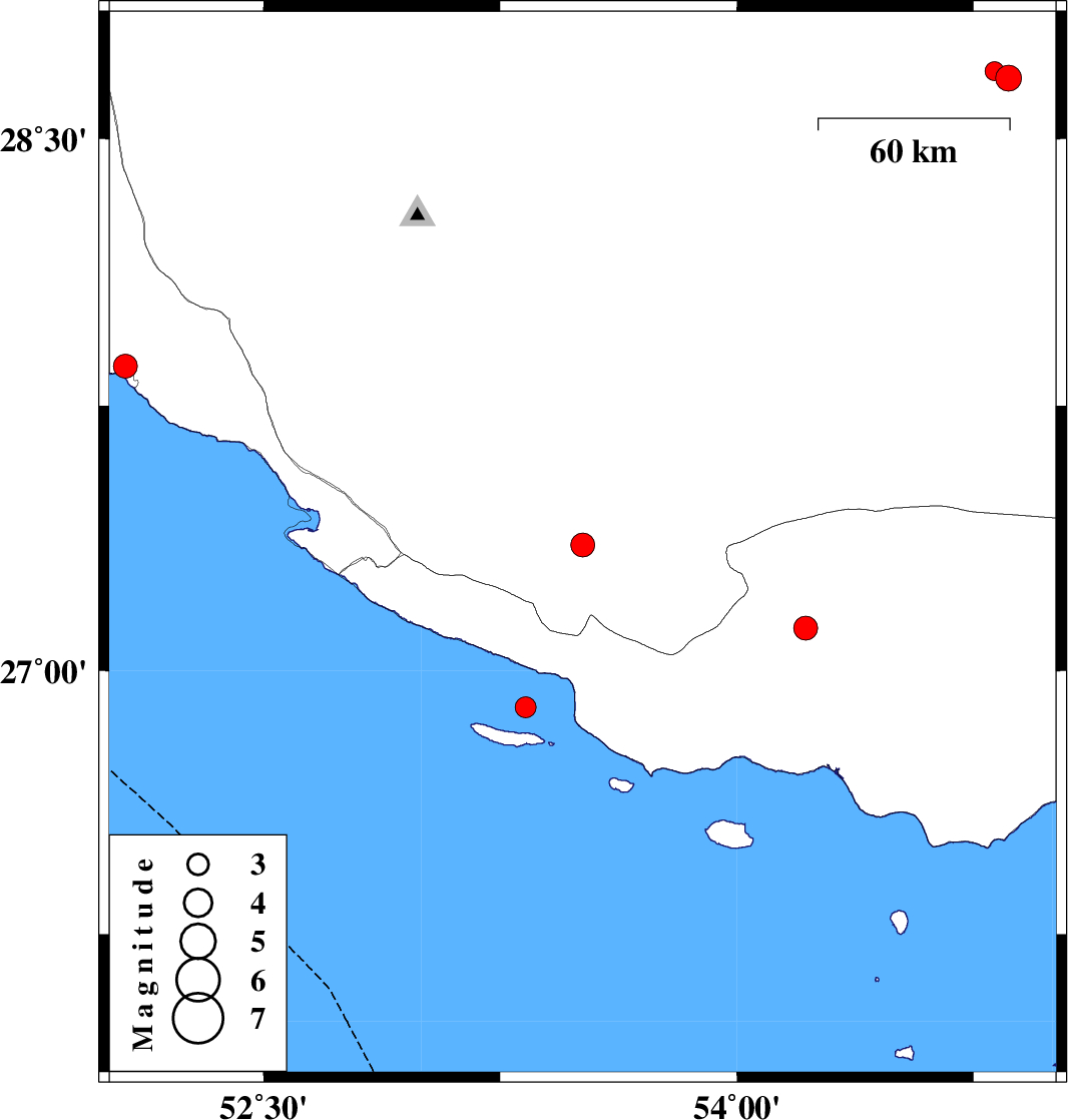 | 2018/09/16 | 02:03:09.1 | 06:33:09.1 | 26.896 | 53.33 | 16 | ML:3 | Persian Gulf, 51 km South-East of Lamerd | ||