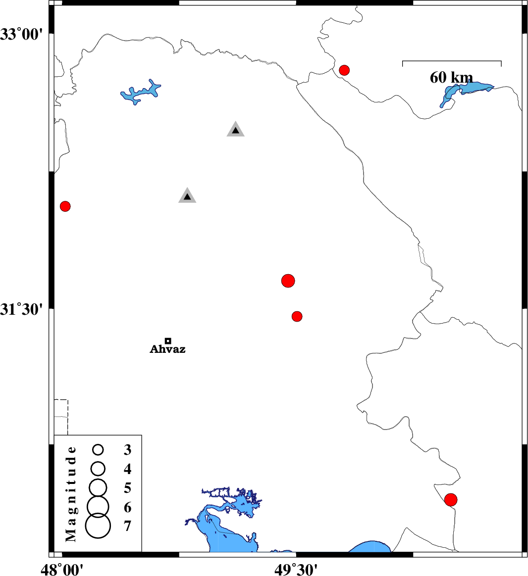 | 2018/08/27 | 23:45:57.5 | 04:15:57.5 | 32.06 | 48.02 | 15 | ML:2.9 | Khoozestan Province, 27 km South-West of Shush |