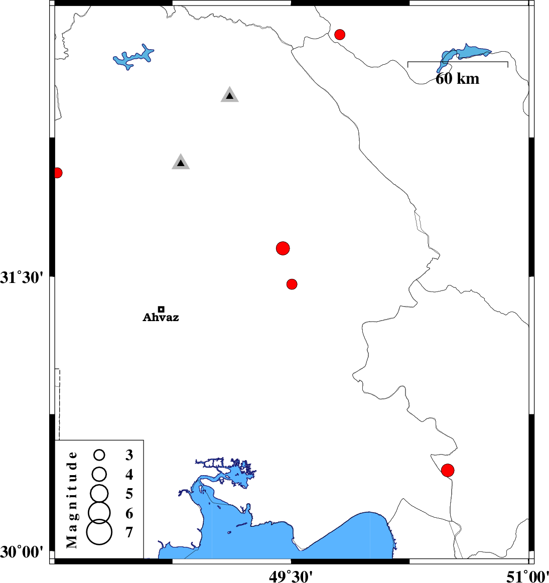| 2018/08/27 | 23:45:57.5 | 04:15:57.5 | 32.06 | 48.02 | 15 | ML:2.9 | Khoozestan Province, 27 km South-West of Shush |